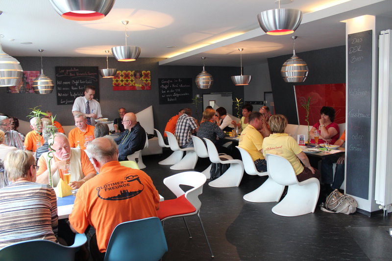 Immer wenn es am schönsten ist, muss man schon wieder aufhören. Das haben sicher viele gedacht, die bei unserem 7. Oldtimertreffen mitgewirkt oder uns am 17. Mai 2014 besucht haben. So groß, so bunt und abwechslungsreich haben wir das noch nie hinbekommen. Ohne Eigenlob - wir lernen dazu und werden immer größer. Anfangs sah es mit dem Wetter doch recht durchwachsen aus, als ob es jeden Moment regnen sollte. Aber ab 10:00 Uhr lukte gelegentlich die Sonne durch und gewann den Kampf. Die Kinder hatten uns schon früh entdeckt. Hüpfburg und Spiele vom "Freizi", Trabbi anmalen (sponsored by Fa. Franz Reinigungstechnik) Eis u.v.a. Aber auch die Sammler und Jäger kamen auf ihre Kosten, hatten doch viele Händler ihre Stände bei uns aufgeschlagen. Da gab es viele zufriedene Gesichter. Unser OB Bernward Küper ließ sich trotz Termindruck und Wahlstress nicht lumpen und kam kurz zu Besuch, der dann wieder länger dauerte als geplant. Jeder der vom Oldivirus befallen ist, weiß auch warum.... Auch die Ess- und Trinkbuden waren stark frequentiert und zum Teil bereits zur Mittagszeit in Nöten, so lang wurden die Schlangen. Da mussten auf die Schnelle sogar aus den umliegenden Supermärkte Brötchen gekauft werden.